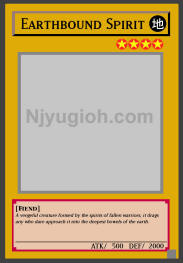 Earthbound Spirit EARTH / Fiend / Level 4 / ATK 500 / DEF 2000 A vengeful creature formed by the spirits of fallen warriors, it drags any who dare approach it into the deepest bowels of the earth. COMMON |