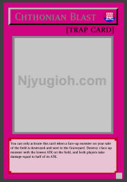 Chthonian Blast Normal Trap You can only activate this card when a face-up monster on your side of the field is destroyed and sent to the Graveyard. Destroy 1 face-up monster with the lowest ATK on the field, and both players take damage equal to half of its ATK. RARE |