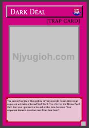 Dark Deal Normal Trap You can only activate this card by paying 1000 Life Points when your opponent activates a Normal Spell Card. The effect of the Normal Spell Card that your opponent activated at that time becomes "Your opponent discards 1 random card from their hand". COMMON |