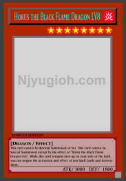 Horus the Black Flame Dragon LV8 FIRE / Dragon / Level 8 / ATK 3000 / DEF 1800 This card cannot be Normal Summoned or Set. This card cannot be Special Summoned except by the effect of "Horus the Black Flame Dragon LV6". While this card remains face-up on your side of the field, you can negate the activation and effect of any Spell Cards and destroy them. SECRET RARE |