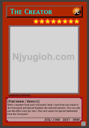 The Creator LIGHT / Thunder / Level 8 / ATK 2300 / DEF 3000 Select 1 monster from your Graveyard. Send 1 card from your hand to the Graveyard and Special Summon the selected monster. You can only use this effect once per turn. This card cannot be Special Summoned from the Graveyard. SECRET RARE |