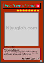 Sacred Phoenix of Nephthys FIRE / Winged Beast / Level 8 / ATK 2400 / DEF 1600 If this card is destroyed by a card effect, Special Summon this card during your next Standby Phase. If you Special Summon this card in this way, destroy all Spell and Trap Cards on the field. SECRET RARE |