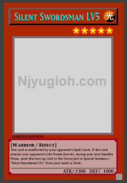 Silent Swordsman LV5 LIGHT / Warrior / Level 5 / ATK 2300 / DEF 1000 This card is unaffected by your opponent's Spell Cards. If this card attacks your opponent's Life Points directly, during your next Standby Phase, send this face-up card to the Graveyard to Special Summon 1 "Silent Swordsman LV7" from your hand or Deck. SECRET RARE |