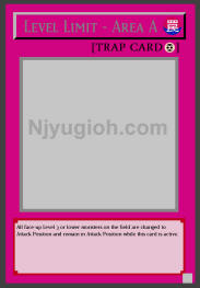 Level Limit - Area A Continuous Trap All face-up Level 3 or lower monsters on the field are changed to Attack Position and remain in Attack Position while this card is active. RARE |