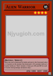 Alien Warrior EARTH / Reptile / Level 4 / ATK 1800 / DEF 1000 When this card is destroyed by battle and sent to the Graveyard, place 2 A-Counters on the monster that destroyed it. (If a monster with an A-Counter battles an "Alien" monster, it loses 300 ATK and DEF for each A-Counter during damage calculation only.) SUPER RARE |