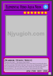 Elemental Hero Aqua Neos WATER / Warrior-Type Fusion / Level 7 / ATK 2500 / DEF 2000 "Elemental Hero Neos" + "Neo-Spacian Aqua Dolphin" This card can only be Special Summoned from your Fusion Deck by returning the above cards from your side of the field to the Deck. (You do not use "Polymerization".) Once per turn, by discarding 1 card from your hand, select 1 random card from your opponent's hand and destroy it. This card returns to the Fusion Deck during the End Phase. COMMON |