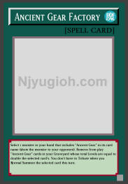 Ancient Gear Factory Normal Spell Select 1 monster in your hand that includes "Ancient Gear" in its card name (show the monster to your opponent). Remove from play "Ancient Gear" cards in your Graveyard whose total Levels are equal to double the selected card's. You don't have to Tribute when you Normal Summon the selected card this turn. SUPER RARE |