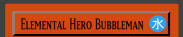Elemental Hero Bubbleman WATER / Warrior / Level 4 / ATK 800 / DEF 1200 If this is the only card in your hand, you can Special Summon this card from your hand. When this card is Normal Summoned, Flip Summoned or Special Summoned successfully, if there are no other cards on your side of the field and in your hand, you can draw 2 cards from your Deck. COMMON |