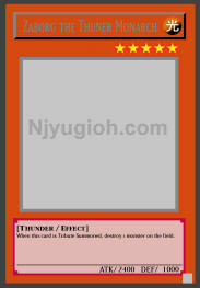Zaborg the Thunder Monarch LIGHT / Thunder / Level 5 / ATK 2400 / DEF 1000 When this card is Tribute Summoned, destroy 1 monster on the field. RARE |