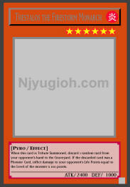Thestalos the Firestorm Monarch FIRE / Pyro / Level 6 / ATK 2400 / DEF 1000 When this card is Tribute Summoned, discard 1 random card from your opponent's hand to the Graveyard. If the discarded card was a Monster Card, inflict damage to your opponent's Life Points equal to the Level of the monster x 100 points. RARE |