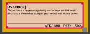 Dark Blade DARK / Warrior / Level 4 / ATK 1800 / DEF 1500 They say he is a dragon manipulating warrior from the dark world. His attack is tremendous, using his great swords with vicious power. COMMON |