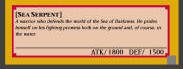 Sea Serpent Warrior of Darkness WATER / Sea Serpent / Level 4 / ATK 1800 / DEF 1500 A warrior who defends the world of the Sea of Darkness. He prides himself on his fighting prowess both on the ground and, of course, in the water. COMMON |