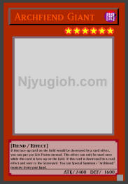 Archfiend Giant DARK / Fiend / Level 6 / ATK 2400 / DEF 1600 If this face-up card on the field would be destroyed by a card effect, you can pay 500 Life Points instead. This effect can only be used once while this card is face-up on the field. If this card is destroyed by a card effect and sent to the Graveyard: You can Special Summon 1 "Archfiend" monster from your hand. ULTRA RARE |