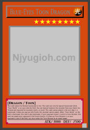 Blue-Eyes Toon Dragon LIGHT / Dragon-Type Toon / Level 8 / ATK 3000 / DEF 2500 This card cannot be Normal Summoned or Set. This card can only be Special Summoned while "Toon World" is on your side the field. You can Special Summon this monster from your hand, but Tributes are required for monsters Level 5 or more. This card cannot attack in the turn that it is Summoned. Unless you pay 500 Life Points, this monster cannot attack. When "Toon World" on the field is destroyed, this card is also destroyed. If your opponent doesn't control a Toon Monster, this card can attack your opponent's Life Points directly. If a face-up Toon Monster is on your opponent's side of the field, you must select the Toon Monster as an attack target. RARE |