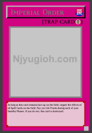Imperial Order Continuous Trap As long as this card remains face-up on the field, negate the effects of all Spell Cards on the field. Pay 700 Life Points during each of your Standby Phases. If you do not, this card is destroyed. RARE |