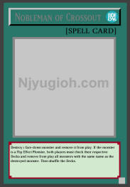 Nobleman of Crossout Normal Spell Destroy 1 face-down monster and remove it from play. If the monster is a Flip Effect Monster, both players must check their respective Decks and remove from play all monsters with the same name as the destroyed monster. Then shuffle the Decks. RARE |
