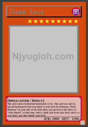 Dark Sage DARK / Spellcaster / Level 9 / ATK 2800 / DEF 3200 This card cannot be Normal Summoned or Set. This card can only be Special Summoned from your hand or your Deck by Tributing 1 "Dark Magician" on your side of the field when you succeed in the effect of "Time Wizard". At that time, select 1 Spell Card from your Deck, add it to your hand, and then shuffle your Deck. RARE |