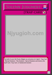 Solemn Judgment Counter Trap Pay half of your Life Points. Negate an activation of a Spell / Trap Card / Normal Summon / Flip Summon / Special Summon and destroy the Spell Card, Trap Card, or Summoned monster. RARE |