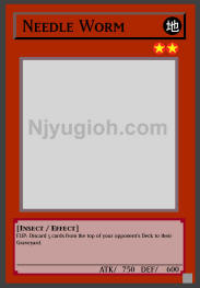 Needle Worm EARTH / Insect / Level 2 / ATK 750 / DEF 600 FLIP: Discard 5 cards from the top of your opponent's Deck to their Graveyard. SUPER RARE |