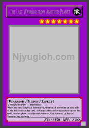 The Last Warrior from Another Planet EARTH / Warrior-Type Fusion / Level 7 / ATK 2350 / DEF 2300 "Zombyra the Dark" + "Maryokutai" When this card is Special Summoned, destroy all monsters on your side of the field except this card. As long as this card remains face-up on the field, neither player can Normal Summon, Flip Summon or Special Summon any monster. RARE |