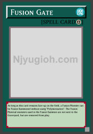 Fusion Gate Field Spell As long as this card remains face-up on the field, a Fusion Monster can be Fusion Summoned without using "Polymerization". The Fusion Material monsters used in the Fusion Summon are not sent to the Graveyard, but are removed from play. SUPER RARE |