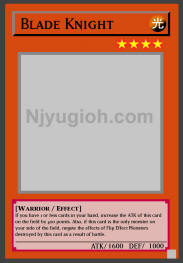Blade Knight LIGHT / Warrior / Level 4 / ATK 1600 / DEF 1000 If you have 1 or less cards in your hand, increase the ATK of this card on the field by 400 points. Also, if this card is the only monster on your side of the field, negate the effects of Flip Effect Monsters destroyed by this card as a result of battle. COMMON |