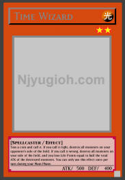 Time Wizard LIGHT / Spellcaster / Level 2 / ATK 500 / DEF 400 Toss a coin and call it. If you call it right, destroy all monsters on your opponent's side of the field. If you call it wrong, destroy all monsters on your side of the field, and you lose Life Points equal to half the total ATK of the destroyed monsters. You can only use this effect once per turn during your Main Phase. RARE |