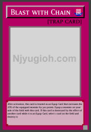 Blast with Chain Normal Trap After activation, this card is treated as an Equip Card that increases the ATK of the equipped monster by 500 points. Equip a monster on your side of the field with this card. If this card is destroyed by the effect of another card while it is an Equip Card, select 1 card on the field and destroy it. SUPER RARE |