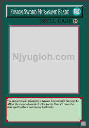 Fusion Sword Murasame Blade Equip Spell You can only equip this card to a Warrior-Type monster. Increase the ATK of the equipped monster by 800 points. This card cannot be destroyed by effects that destroy Spell Cards. SUPER RARE |