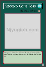 Second Coin Toss Continuous Spell As long as this card remains face-up on the field, you can negate the effects of a card requiring a coin toss once per turn and redo the coin toss. SUPER RARE |