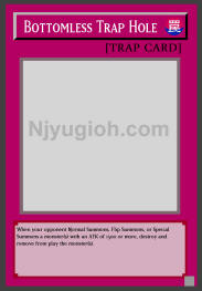 Bottomless Trap Hole Normal Trap When your opponent Normal Summons, Flip Summons, or Special Summons a monster(s) with an ATK of 1500 or more, destroy and remove from play the monster(s). SUPER RARE |