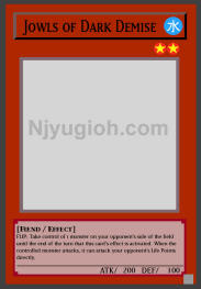 Jowls of Dark Demise WATER / Fiend / Level 2 / ATK 200 / DEF 100 FLIP: Take control of 1 monster on your opponent's side of the field until the end of the turn that this card's effect is activated. When the controlled monster attacks, it can attack your opponent's Life Points directly. SUPER RARE |