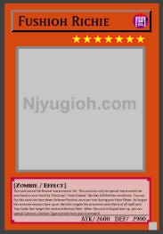 Fushioh Richie DARK / Zombie / Level 7 / ATK 2600 / DEF 2900 This card cannot be Normal Summoned or Set. This card can only be Special Summoned from your hand or your Deck by Tributing 1 "Great Dezard" that has fulfilled the conditions. You can flip this card into face-down Defense Position once per turn during your Main Phase. As long as this monster remains face-up on the field, negate the activation and effects of all Spell and Trap Cards that target this card and destroy them. When this card is flipped face-up, you can Special Summon 1 Zombie-Type monster from your Graveyard. COMMON |