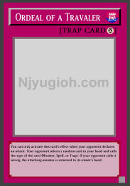 Ordeal of a Traveler Continuous Trap You can only activate this card's effect when your opponent declares an attack. Your opponent selects 1 random card in your hand and calls the type of the card (Monster, Spell, or Trap). If your opponent calls it wrong, the attacking monster is returned to its owner's hand. SUPER RARE |