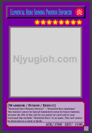Elemental Hero Shining Phoenix Enforcer FIRE / Warrior-Type Fusion / Level 8 / ATK 2500 / DEF 2100 "Elemental Hero Phoenix Enforcer" + "Elemental Hero Sparkman" This monster cannot be Special Summoned except by Fusion Summon. Increase the ATK of this card by 300 points for each card in your Graveyard that includes "Elemental Hero" in its name. This card cannot be destroyed as a result of battle. SECRET RARE |