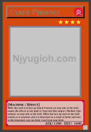 Cyber Phoenix FIRE / Machine / Level 4 / ATK 1200 / DEF 1600 While this card is in face-up Attack Position on your side of the field, negate the effects of any Spell or Trap Card that targets 1 Machine-Type monster on your side of the field. When this face-up card on the field attacks or is attacked, and it is destroyed as a result of battle and sent to the Graveyard, you can draw 1 card from your Deck. RARE |