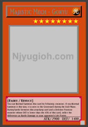 Majestic Mech - Goryu LIGHT / Fairy / Level 8 / ATK 2900 / DEF 1400 You can Normal Summon this card by Tributing 1 monster. If you Normal Summon it this way, it is sent to the Graveyard during the End Phase. During battle between this attacking card and a Defense Position monster whose DEF is lower than the ATK of this card, inflict the difference as Battle Damage to your opponent's Life Points. RARE |