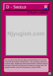 D - Shield Normal Trap You can only activate this card when an Attack Position on your side of the field that includes "Destiny Hero" in its card name is selected as an attack target. Change that attack target monster to Defense Position and equip it with this card (this card is treated as an Equip Card). The equipped monster cannot be destroyed as a result of battle. SUPER RARE |